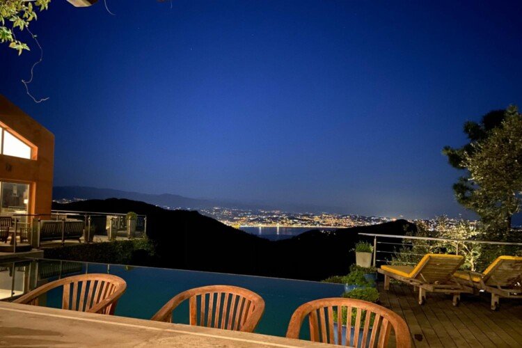 Situated in an exclusive, private residential, hillside area, the contemporary villa affords spectacular, panoramic views of the Bay of Cannes and beyond to Nice and Italy.