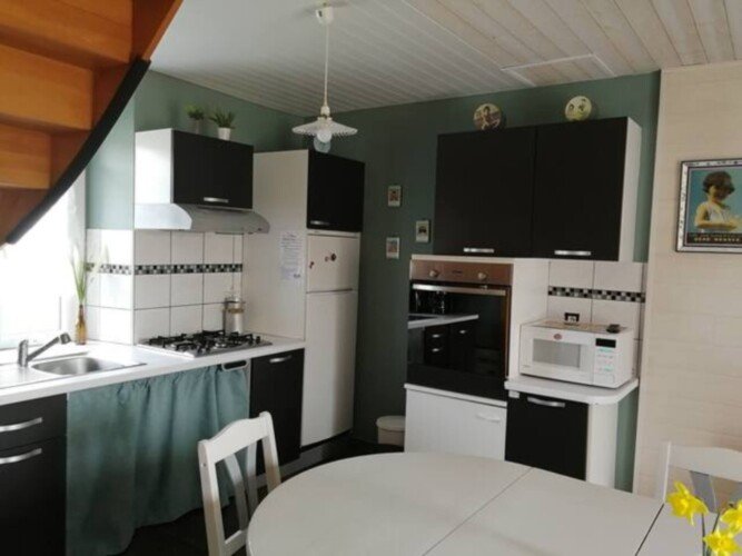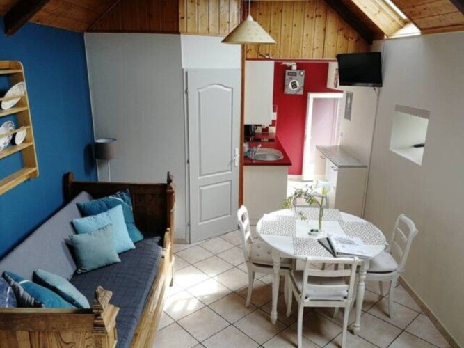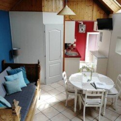 Le gîte « La cabane à bois » pour 4 personnes (1 couple+2 enfants hauteur limitée) très lumineux. Avec terrasse ensoleillée. Composé au rdc d’un coin cuisine équipée, pièce de vie, avec lit de coin canapé. Salle d’eau avec douche et wc. 2 marches menant à la chambre double. A L’étage : La « chambrette » (hauteur limitée 1,70m) est conseillée pour 2 enfants.