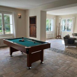 La maison principale très spacieuse et lumineuse, contient une cuisine super équipée, 2 salons (2 cheminées, un billard), une salle home cinéma, un bureau avec vue sur la piscine, un vestiaire et 4 chambres (lit double 1,8m) avec chacune leur salle de bain + wc.