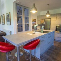 Kitchen with central island, breakfast bar, microwave, dishwasher, hob and oven and American-style fridge freezer.